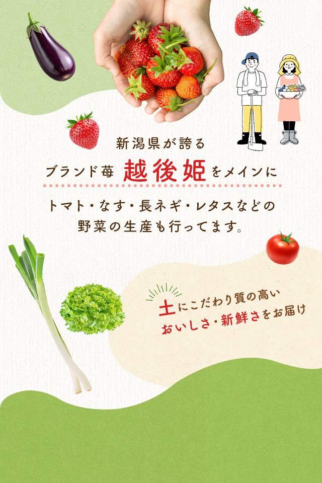 山倉農園では、新潟が誇るブランド苺「越後姫」を栽培しています。自家製有機質肥料で育てた苺は、ジューシーで濃厚な甘さが特徴。春を感じさせる甘酸っぱい香りとともに、一口で広がる美味しさが魅力です。これまで県内中心に流通してきましたが、全国の皆様にもその美味しさをお届けしたく、全国発送を開始しました。山倉農園の新鮮な越後姫は新潟直送計画からご確認ください♪